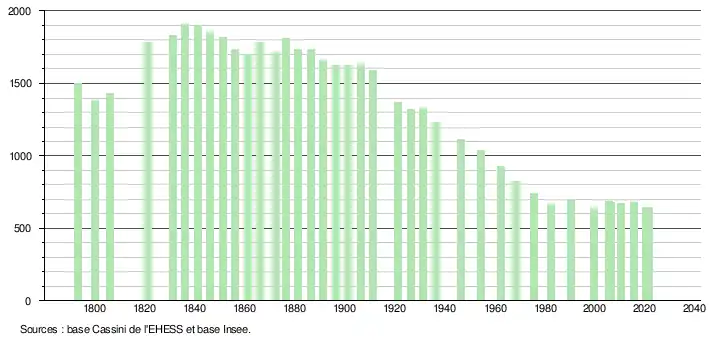 L'évolution du nombre d'habitants est connue à travers les recensements de la population effectués dans la commune depuis 1793. Pour les communes de moins de 10 000 habitants, une enquête de recensement portant sur toute la population est réalisée tous les cinq ans, les populations légales des années intermédiaires étant quant à elles estimées par interpolation ou extrapolation[18]. Pour la commune, le premier recensement exhaustif entrant dans le cadre du nouveau dispositif a été réalisé en 2005[19].
