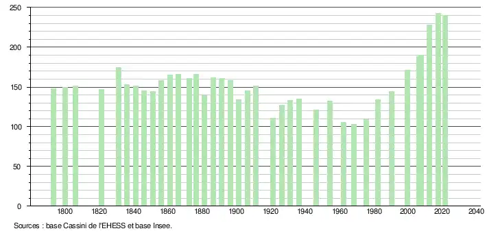 L'évolution du nombre d'habitants est connue à travers les recensements de la population effectués dans la commune depuis 1793. Pour les communes de moins de 10 000 habitants, une enquête de recensement portant sur toute la population est réalisée tous les cinq ans, les populations légales des années intermédiaires étant quant à elles estimées par interpolation ou extrapolation[48]. Pour la commune, le premier recensement exhaustif entrant dans le cadre du nouveau dispositif a été réalisé en 2007[49].