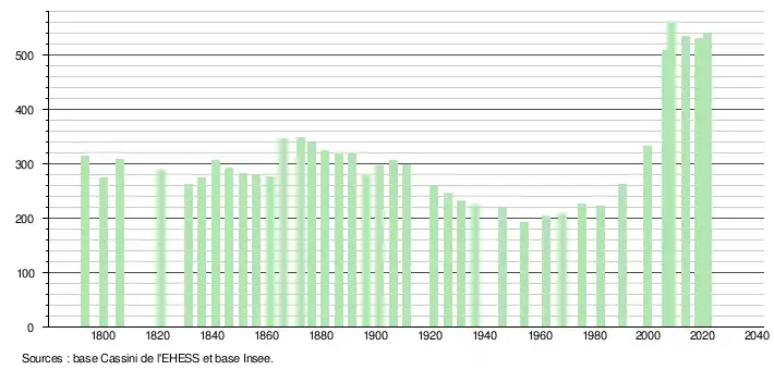 L'évolution du nombre d'habitants est connue à travers les recensements de la population effectués dans la commune depuis 1793. Pour les communes de moins de 10 000 habitants, une enquête de recensement portant sur toute la population est réalisée tous les cinq ans, les populations légales des années intermédiaires étant quant à elles estimées par interpolation ou extrapolation[18]. Pour la commune, le premier recensement exhaustif entrant dans le cadre du nouveau dispositif a été réalisé en 2008[19].