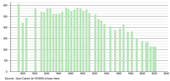 L'évolution du nombre d'habitants est connue à travers les recensements de la population effectués dans la commune depuis 1793. Pour les communes de moins de 10 000 habitants, une enquête de recensement portant sur toute la population est réalisée tous les cinq ans, les populations légales des années intermédiaires étant quant à elles estimées par interpolation ou extrapolation[16]. Pour la commune, le premier recensement exhaustif entrant dans le cadre du nouveau dispositif a été réalisé en 2008[17].