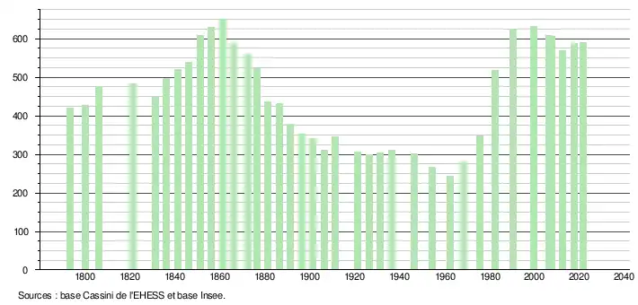 L'évolution du nombre d'habitants est connue à travers les recensements de la population effectués dans la commune depuis 1793. Pour les communes de moins de 10 000 habitants, une enquête de recensement portant sur toute la population est réalisée tous les cinq ans, les populations légales des années intermédiaires étant quant à elles estimées par interpolation ou extrapolation[27]. Pour la commune, le premier recensement exhaustif entrant dans le cadre du nouveau dispositif a été réalisé en 2007[28].