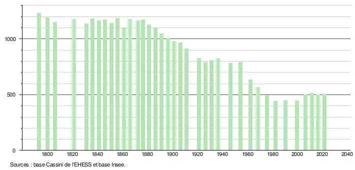 L'évolution du nombre d'habitants est connue à travers les recensements de la population effectués dans la commune depuis 1793. Pour les communes de moins de 10 000 habitants, une enquête de recensement portant sur toute la population est réalisée tous les cinq ans, les populations légales des années intermédiaires étant quant à elles estimées par interpolation ou extrapolation[21]. Pour la commune, le premier recensement exhaustif entrant dans le cadre du nouveau dispositif a été réalisé en 2006[22].