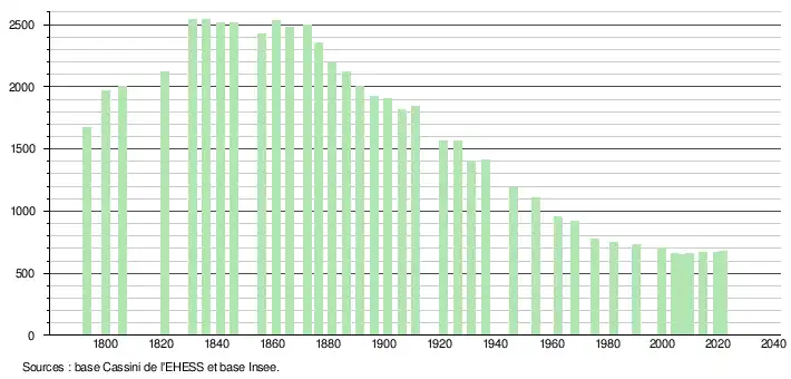 L'évolution du nombre d'habitants est connue à travers les recensements de la population effectués dans la commune depuis 1793. Pour les communes de moins de 10 000 habitants, une enquête de recensement portant sur toute la population est réalisée tous les cinq ans, les populations légales des années intermédiaires étant quant à elles estimées par interpolation ou extrapolation[23]. Pour la commune, le premier recensement exhaustif entrant dans le cadre du nouveau dispositif a été réalisé en 2004[24].