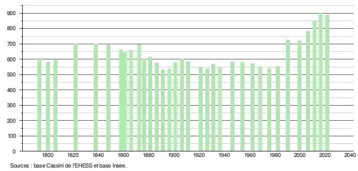 L'évolution du nombre d'habitants est connue à travers les recensements de la population effectués dans la commune depuis 1793. Pour les communes de moins de 10 000 habitants, une enquête de recensement portant sur toute la population est réalisée tous les cinq ans, les populations légales des années intermédiaires étant quant à elles estimées par interpolation ou extrapolation[15]. Pour la commune, le premier recensement exhaustif entrant dans le cadre du nouveau dispositif a été réalisé en 2006[16].