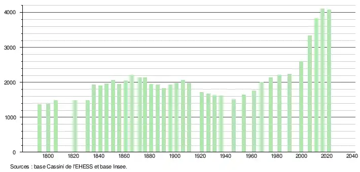 L'évolution du nombre d'habitants est connue à travers les recensements de la population effectués dans la commune depuis 1793. Pour les communes de moins de 10 000 habitants, une enquête de recensement portant sur toute la population est réalisée tous les cinq ans, les populations légales des années intermédiaires étant quant à elles estimées par interpolation ou extrapolation[23]. Pour la commune, le premier recensement exhaustif entrant dans le cadre du nouveau dispositif a été réalisé en 2006[24].