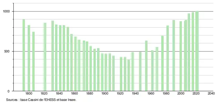L'évolution du nombre d'habitants est connue à travers les recensements de la population effectués dans la commune depuis 1793. Pour les communes de moins de 10 000 habitants, une enquête de recensement portant sur toute la population est réalisée tous les cinq ans, les populations légales des années intermédiaires étant quant à elles estimées par interpolation ou extrapolation[16]. Pour la commune, le premier recensement exhaustif entrant dans le cadre du nouveau dispositif a été réalisé en 2005[17].