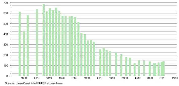L'évolution du nombre d'habitants est connue à travers les recensements de la population effectués dans la commune depuis 1793. Pour les communes de moins de 10 000 habitants, une enquête de recensement portant sur toute la population est réalisée tous les cinq ans, les populations légales des années intermédiaires étant quant à elles estimées par interpolation ou extrapolation[24]. Pour la commune, le premier recensement exhaustif entrant dans le cadre du nouveau dispositif a été réalisé en 2008[25].
