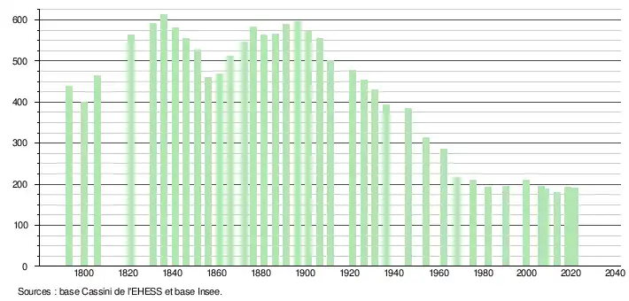 L'évolution du nombre d'habitants est connue à travers les recensements de la population effectués dans la commune depuis 1793. Pour les communes de moins de 10 000 habitants, une enquête de recensement portant sur toute la population est réalisée tous les cinq ans, les populations légales des années intermédiaires étant quant à elles estimées par interpolation ou extrapolation[14]. Pour la commune, le premier recensement exhaustif entrant dans le cadre du nouveau dispositif a été réalisé en 2008[15].