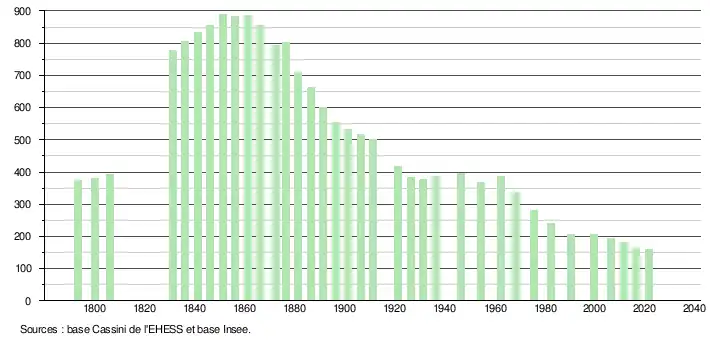L'évolution du nombre d'habitants est connue à travers les recensements de la population effectués dans la commune depuis 1793. Pour les communes de moins de 10 000 habitants, une enquête de recensement portant sur toute la population est réalisée tous les cinq ans, les populations légales des années intermédiaires étant quant à elles estimées par interpolation ou extrapolation[21]. Pour la commune, le premier recensement exhaustif entrant dans le cadre du nouveau dispositif a été réalisé en 2006[22].