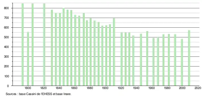 L'évolution du nombre d'habitants est connue à travers les recensements de la population effectués dans la commune depuis 1793. À partir du , les populations légales des communes sont publiées annuellement dans le cadre d'un recensement qui repose désormais sur une collecte d'information annuelle, concernant successivement tous les territoires communaux au cours d'une période de cinq ans. Pour les communes de moins de 10 000 habitants, une enquête de recensement portant sur toute la population est réalisée tous les cinq ans, les populations légales des années intermédiaires étant quant à elles estimées par interpolation ou extrapolation[8]. Pour la commune, le premier recensement exhaustif entrant dans le cadre du nouveau dispositif a été réalisé en 2008[9],[Note 1].