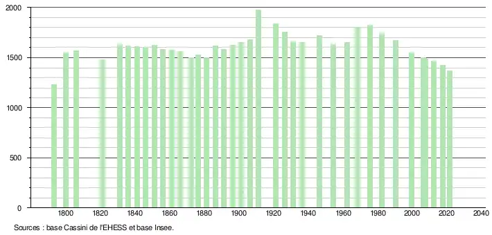 L'évolution du nombre d'habitants est connue à travers les recensements de la population effectués dans la commune depuis 1793. Pour les communes de moins de 10 000 habitants, une enquête de recensement portant sur toute la population est réalisée tous les cinq ans, les populations légales des années intermédiaires étant quant à elles estimées par interpolation ou extrapolation[32]. Pour la commune, le premier recensement exhaustif entrant dans le cadre du nouveau dispositif a été réalisé en 2007[33].
