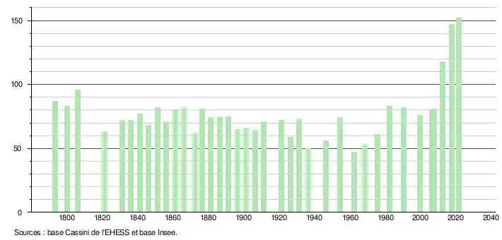 L'évolution du nombre d'habitants est connue à travers les recensements de la population effectués dans la commune depuis 1793. Pour les communes de moins de 10 000 habitants, une enquête de recensement portant sur toute la population est réalisée tous les cinq ans, les populations légales des années intermédiaires étant quant à elles estimées par interpolation ou extrapolation[18]. Pour la commune, le premier recensement exhaustif entrant dans le cadre du nouveau dispositif a été réalisé en 2007[19].