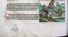 Capture d'un « poisson lion ». Petite illustration de la version latine. À noter les capitales à l'encre rouge, et la présence d'un marginalium en bas de page.
