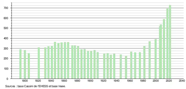 L'évolution du nombre d'habitants est connue à travers les recensements de la population effectués dans la commune depuis 1793. Pour les communes de moins de 10 000 habitants, une enquête de recensement portant sur toute la population est réalisée tous les cinq ans, les populations légales des années intermédiaires étant quant à elles estimées par interpolation ou extrapolation[18]. Pour la commune, le premier recensement exhaustif entrant dans le cadre du nouveau dispositif a été réalisé en 2007[19].