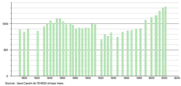 L'évolution du nombre d'habitants est connue à travers les recensements de la population effectués dans la commune depuis 1793. Pour les communes de moins de 10 000 habitants, une enquête de recensement portant sur toute la population est réalisée tous les cinq ans, les populations légales des années intermédiaires étant quant à elles estimées par interpolation ou extrapolation[16]. Pour la commune, le premier recensement exhaustif entrant dans le cadre du nouveau dispositif a été réalisé en 2007[17].