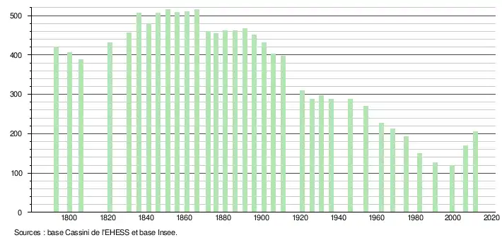 L'évolution du nombre d'habitants est connue à travers les recensements de la population effectués dans la commune depuis 1793. À partir du , les populations légales des communes sont publiées annuellement dans le cadre d'un recensement qui repose désormais sur une collecte d'information annuelle, concernant successivement tous les territoires communaux au cours d'une période de cinq ans. Pour les communes de moins de 10 000 habitants, une enquête de recensement portant sur toute la population est réalisée tous les cinq ans, les populations légales des années intermédiaires étant quant à elles estimées par interpolation ou extrapolation[7]. Pour la commune, le premier recensement exhaustif entrant dans le cadre du nouveau dispositif a été réalisé en 2006[8],[Note 1].