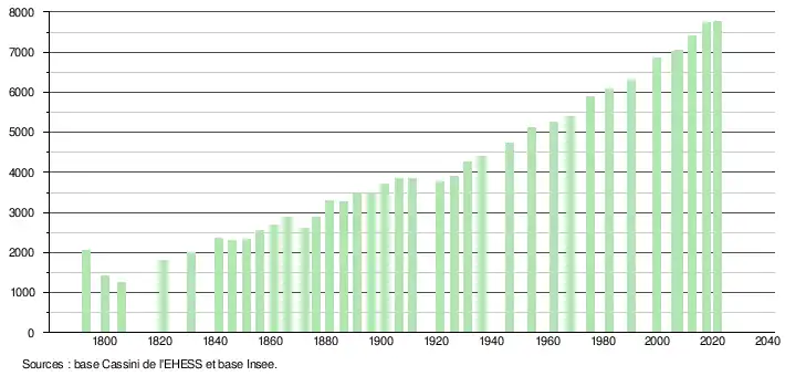 - Par convention dans Wikipédia, et afin de permettre une comparaison correcte entre des recensements espacés d’une période de 5 ans, le principe a été retenu, pour les populations légales postérieures à 1999 d’afficher dans le tableau des recensements : la population 2006, première population légale connue post-1999, les populations légales suivantes correspondant aux années réelles de recensement et enfin la dernière population légale publiée par l’INSEE. Dans le graphique sont par contre représentés l’ensemble des populations légales publiées