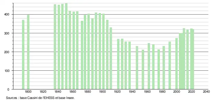 L'évolution du nombre d'habitants est connue à travers les recensements de la population effectués dans la commune depuis 1793. Pour les communes de moins de 10 000 habitants, une enquête de recensement portant sur toute la population est réalisée tous les cinq ans, les populations légales des années intermédiaires étant quant à elles estimées par interpolation ou extrapolation[11]. Pour la commune, le premier recensement exhaustif entrant dans le cadre du nouveau dispositif a été réalisé en 2004[12].