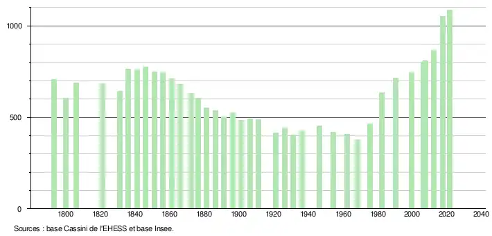 L'évolution du nombre d'habitants est connue à travers les recensements de la population effectués dans la commune depuis 1793. Pour les communes de moins de 10 000 habitants, une enquête de recensement portant sur toute la population est réalisée tous les cinq ans, les populations légales des années intermédiaires étant quant à elles estimées par interpolation ou extrapolation[23]. Pour la commune, le premier recensement exhaustif entrant dans le cadre du nouveau dispositif a été réalisé en 2007[24].