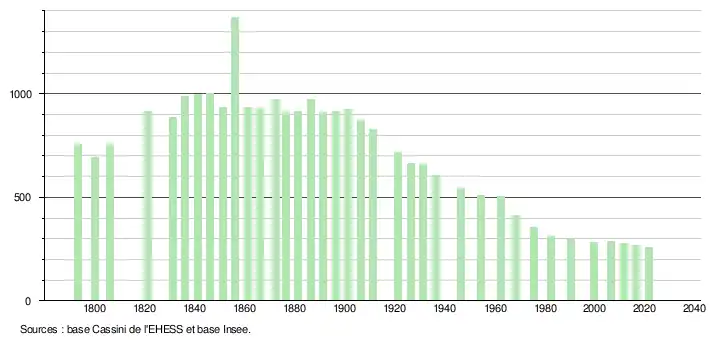 L'évolution du nombre d'habitants est connue à travers les recensements de la population effectués dans la commune depuis 1793. Pour les communes de moins de 10 000 habitants, une enquête de recensement portant sur toute la population est réalisée tous les cinq ans, les populations légales des années intermédiaires étant quant à elles estimées par interpolation ou extrapolation[24]. Pour la commune, le premier recensement exhaustif entrant dans le cadre du nouveau dispositif a été réalisé en 2006[25].