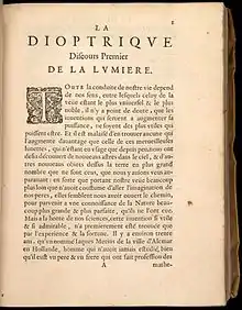« Par la dioptrique, j'eus le dessein de faire valoir qu'on pouvait aller fort avant dans la philosophie pour arriver par son moyen jusqu'à la connaissance des arts qui sont utiles à la vie, à cause que l'invention des lunettes d'approches, que j'y expliquais, est l'une des plus difficiles qui aient jamais été traitées »