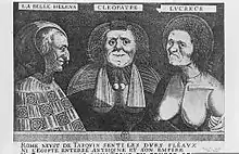 Son visage accumule les marques sordides de la vieillesse, semblable en cela à la Lucrèce d'une gravure de Jaspar Isaac[5] : son cou semble trop long, ses rides sont profondément marquées, son nez est crochu, ses yeux sont enfoncés — si l'œil droit n'est pas visible, les broussailles du sourcil sont cependant figurées —, la mâchoire inférieure est avancée, et laisse voir une mauvaise dentition, alors que l'on suppose celle supérieure édentée.