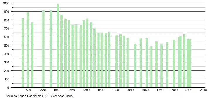 L'évolution du nombre d'habitants est connue à travers les recensements de la population effectués dans la commune depuis 1793. Pour les communes de moins de 10 000 habitants, une enquête de recensement portant sur toute la population est réalisée tous les cinq ans, les populations légales des années intermédiaires étant quant à elles estimées par interpolation ou extrapolation[28]. Pour la commune, le premier recensement exhaustif entrant dans le cadre du nouveau dispositif a été réalisé en 2008[29].