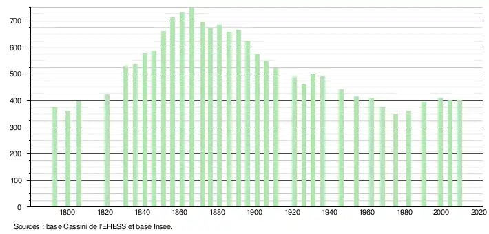 L'évolution du nombre d'habitants est connue à travers les recensements de la population effectués dans la commune depuis 1793. À partir du , les populations légales des communes sont publiées annuellement dans le cadre d'un recensement qui repose désormais sur une collecte d'information annuelle, concernant successivement tous les territoires communaux au cours d'une période de cinq ans. Pour les communes de moins de 10 000 habitants, une enquête de recensement portant sur toute la population est réalisée tous les cinq ans, les populations légales des années intermédiaires étant quant à elles estimées par interpolation ou extrapolation[5]. Pour la commune, le premier recensement exhaustif entrant dans le cadre du nouveau dispositif a été réalisé en 2004[6],[Note 1].