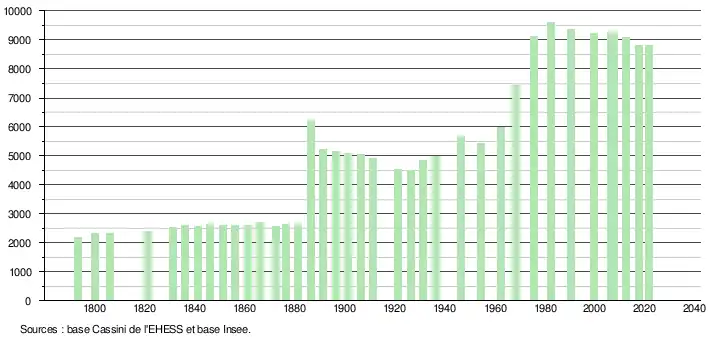L'évolution du nombre d'habitants est connue à travers les recensements de la population effectués dans la commune depuis 1793. Pour les communes de moins de 10 000 habitants, une enquête de recensement portant sur toute la population est réalisée tous les cinq ans, les populations légales des années intermédiaires étant quant à elles estimées par interpolation ou extrapolation[37]. Pour la commune, le premier recensement exhaustif entrant dans le cadre du nouveau dispositif a été réalisé en 2007[38].