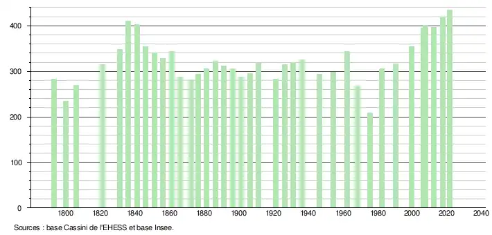 L'évolution du nombre d'habitants est connue à travers les recensements de la population effectués dans la commune depuis 1793. Pour les communes de moins de 10 000 habitants, une enquête de recensement portant sur toute la population est réalisée tous les cinq ans, les populations légales des années intermédiaires étant quant à elles estimées par interpolation ou extrapolation[11]. Pour la commune, le premier recensement exhaustif entrant dans le cadre du nouveau dispositif a été réalisé en 2007[12].