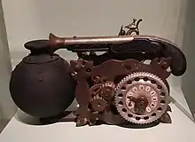 La « machine infernale » destinée à l'assassinat du roi, lors de l'exposition sur Louis de Funès à la Cinémathèque, en 2020.