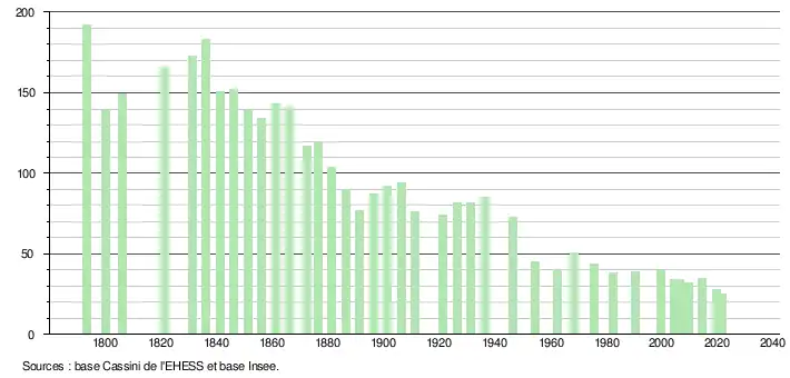 L'évolution du nombre d'habitants est connue à travers les recensements de la population effectués dans la commune depuis 1793. Pour les communes de moins de 10 000 habitants, une enquête de recensement portant sur toute la population est réalisée tous les cinq ans, les populations légales des années intermédiaires étant quant à elles estimées par interpolation ou extrapolation[20]. Pour la commune, le premier recensement exhaustif entrant dans le cadre du nouveau dispositif a été réalisé en 2004[21].