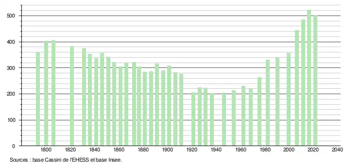 L'évolution du nombre d'habitants est connue à travers les recensements de la population effectués dans la commune depuis 1793. Pour les communes de moins de 10 000 habitants, une enquête de recensement portant sur toute la population est réalisée tous les cinq ans, les populations légales des années intermédiaires étant quant à elles estimées par interpolation ou extrapolation[36]. Pour la commune, le premier recensement exhaustif entrant dans le cadre du nouveau dispositif a été réalisé en 2006[37].
