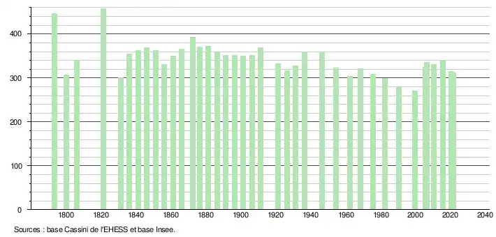 L'évolution du nombre d'habitants est connue à travers les recensements de la population effectués dans la commune depuis 1793. Pour les communes de moins de 10 000 habitants, une enquête de recensement portant sur toute la population est réalisée tous les cinq ans, les populations légales des années intermédiaires étant quant à elles estimées par interpolation ou extrapolation[19]. Pour la commune, le premier recensement exhaustif entrant dans le cadre du nouveau dispositif a été réalisé en 2005[20].