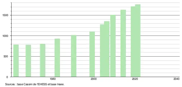 L'évolution du nombre d'habitants est connue à travers les recensements de la population effectués dans la commune depuis 1962. Pour les communes de moins de 10 000 habitants, une enquête de recensement portant sur toute la population est réalisée tous les cinq ans, les populations légales des années intermédiaires étant quant à elles estimées par interpolation ou extrapolation[17]. Pour la commune, le premier recensement exhaustif entrant dans le cadre du nouveau dispositif a été réalisé en 2004[18].
