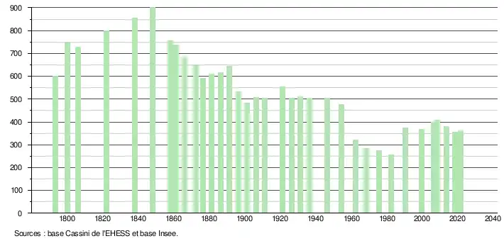 L'évolution du nombre d'habitants est connue à travers les recensements de la population effectués dans la commune depuis 1793. Pour les communes de moins de 10 000 habitants, une enquête de recensement portant sur toute la population est réalisée tous les cinq ans, les populations légales des années intermédiaires étant quant à elles estimées par interpolation ou extrapolation[20]. Pour la commune, le premier recensement exhaustif entrant dans le cadre du nouveau dispositif a été réalisé en 2008[21].