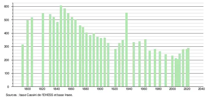 L'évolution du nombre d'habitants est connue à travers les recensements de la population effectués dans la commune depuis 1793. Pour les communes de moins de 10 000 habitants, une enquête de recensement portant sur toute la population est réalisée tous les cinq ans, les populations légales des années intermédiaires étant quant à elles estimées par interpolation ou extrapolation[21]. Pour la commune, le premier recensement exhaustif entrant dans le cadre du nouveau dispositif a été réalisé en 2004[22].