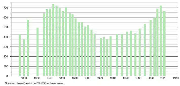 L'évolution du nombre d'habitants est connue à travers les recensements de la population effectués dans la commune depuis 1793. Pour les communes de moins de 10 000 habitants, une enquête de recensement portant sur toute la population est réalisée tous les cinq ans, les populations légales des années intermédiaires étant quant à elles estimées par interpolation ou extrapolation[24]. Pour la commune, le premier recensement exhaustif entrant dans le cadre du nouveau dispositif a été réalisé en 2005[25].