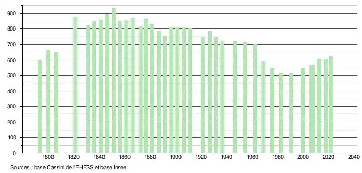 L'évolution du nombre d'habitants est connue à travers les recensements de la population effectués dans la commune depuis 1793. Pour les communes de moins de 10 000 habitants, une enquête de recensement portant sur toute la population est réalisée tous les cinq ans, les populations légales des années intermédiaires étant quant à elles estimées par interpolation ou extrapolation[16]. Pour la commune, le premier recensement exhaustif entrant dans le cadre du nouveau dispositif a été réalisé en 2007[17].