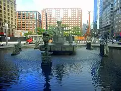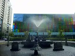 Située entre la nouvelle entrée du Palais des congrès et celle de l'édifice Jacques-Parizeau, autrefois le Centre CDP Capital, la Place Jean-Paul-Riopelle, où est relocalisée la fontaine, a été aménagée sur un ancien stationnement extérieur et sur une partie couverte de l'autoroute Ville-Marie[1].