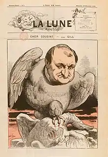 La Lune rousse est lancée le 10 décembre 1876. Les caricatures dessinées par Gill y sont initialement publiées en première page, comme dans l'ancienne formule de L’Éclipse, avant d'occuper toute la largeur de la double page centrale dès le 11 février 1877.