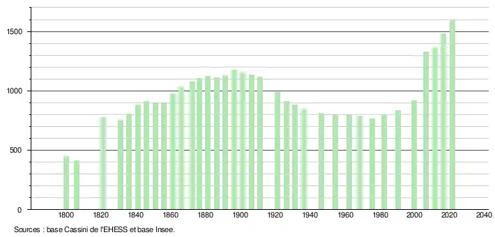L'évolution du nombre d'habitants est connue à travers les recensements de la population effectués dans la commune depuis 1800. Pour les communes de moins de 10 000 habitants, une enquête de recensement portant sur toute la population est réalisée tous les cinq ans, les populations légales des années intermédiaires étant quant à elles estimées par interpolation ou extrapolation[20]. Pour la commune, le premier recensement exhaustif entrant dans le cadre du nouveau dispositif a été réalisé en 2006[21].