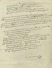 - le manuscrit autographe des vers 21-33 de la lettre de Mikhaïl Lermontov à Alexandre Tourgueniev (ru)(RGALI) du [alpha 4].