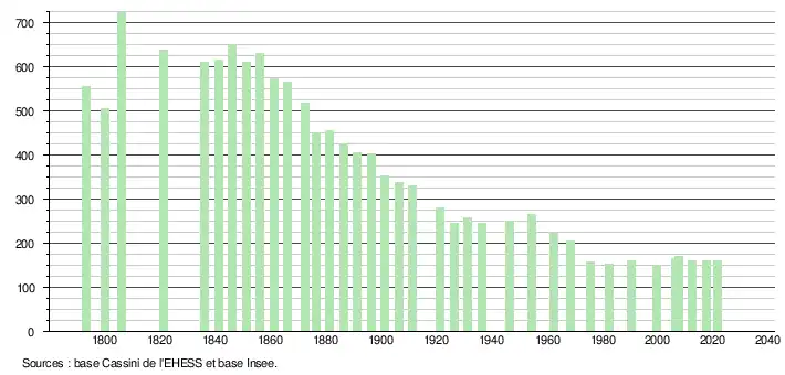 L'évolution du nombre d'habitants est connue à travers les recensements de la population effectués dans la commune depuis 1793. Pour les communes de moins de 10 000 habitants, une enquête de recensement portant sur toute la population est réalisée tous les cinq ans, les populations légales des années intermédiaires étant quant à elles estimées par interpolation ou extrapolation[18]. Pour la commune, le premier recensement exhaustif entrant dans le cadre du nouveau dispositif a été réalisé en 2007[19].