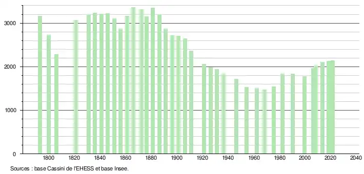 L'évolution du nombre d'habitants est connue à travers les recensements de la population effectués dans la commune depuis 1793. Pour les communes de moins de 10 000 habitants, une enquête de recensement portant sur toute la population est réalisée tous les cinq ans, les populations légales des années intermédiaires étant quant à elles estimées par interpolation ou extrapolation[24]. Pour la commune, le premier recensement exhaustif entrant dans le cadre du nouveau dispositif a été réalisé en 2008[25].