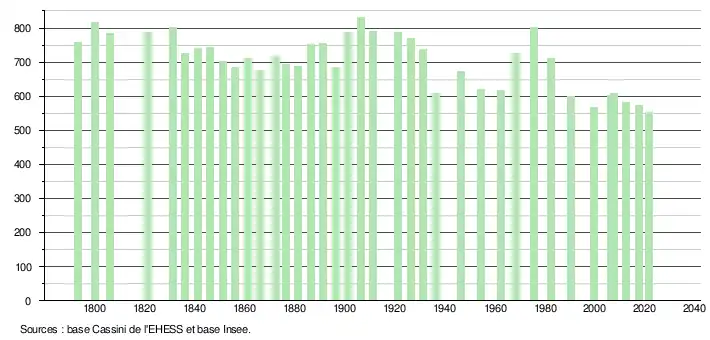 L'évolution du nombre d'habitants est connue à travers les recensements de la population effectués dans la commune depuis 1793. Pour les communes de moins de 10 000 habitants, une enquête de recensement portant sur toute la population est réalisée tous les cinq ans, les populations légales des années intermédiaires étant quant à elles estimées par interpolation ou extrapolation[31]. Pour la commune, le premier recensement exhaustif entrant dans le cadre du nouveau dispositif a été réalisé en 2007[32].