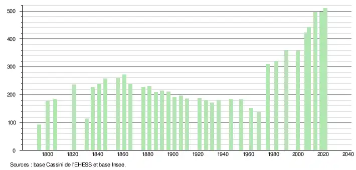 L'évolution du nombre d'habitants est connue à travers les recensements de la population effectués dans la commune depuis 1793. Pour les communes de moins de 10 000 habitants, une enquête de recensement portant sur toute la population est réalisée tous les cinq ans, les populations légales des années intermédiaires étant quant à elles estimées par interpolation ou extrapolation[20]. Pour la commune, le premier recensement exhaustif entrant dans le cadre du nouveau dispositif a été réalisé en 2008[21].