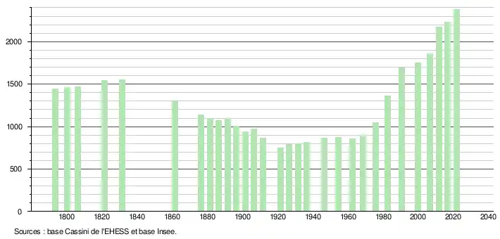 L'évolution du nombre d'habitants est connue à travers les recensements de la population effectués dans la commune depuis 1793. Pour les communes de moins de 10 000 habitants, une enquête de recensement portant sur toute la population est réalisée tous les cinq ans, les populations légales des années intermédiaires étant quant à elles estimées par interpolation ou extrapolation[23]. Pour la commune, le premier recensement exhaustif entrant dans le cadre du nouveau dispositif a été réalisé en 2006[24].