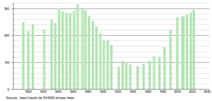 L'évolution du nombre d'habitants est connue à travers les recensements de la population effectués dans la commune depuis 1793. Pour les communes de moins de 10 000 habitants, une enquête de recensement portant sur toute la population est réalisée tous les cinq ans, les populations légales des années intermédiaires étant quant à elles estimées par interpolation ou extrapolation[36]. Pour la commune, le premier recensement exhaustif entrant dans le cadre du nouveau dispositif a été réalisé en 2007[37].