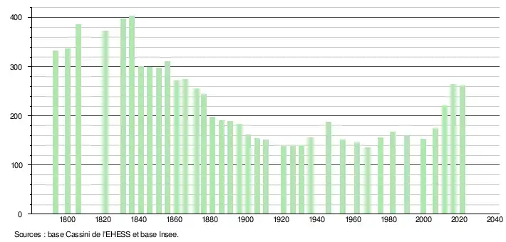 L'évolution du nombre d'habitants est connue à travers les recensements de la population effectués dans la commune depuis 1793. Pour les communes de moins de 10 000 habitants, une enquête de recensement portant sur toute la population est réalisée tous les cinq ans, les populations légales des années intermédiaires étant quant à elles estimées par interpolation ou extrapolation[20]. Pour la commune, le premier recensement exhaustif entrant dans le cadre du nouveau dispositif a été réalisé en 2006[21].